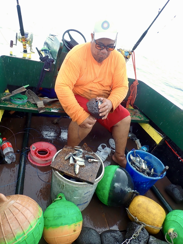 A la pêche aux cailloux avec le copain Tafeta. Il attache des petits poissons sur un caillou qui plombera sa ligne. Arrivé au plus bas son nœud savant se détache d’une légère secousse. Ainsi l’appât se trouve à portée des gros thons à 150m de fond / Tortue au coté d’Oxygen au mouillage de Hapatoni