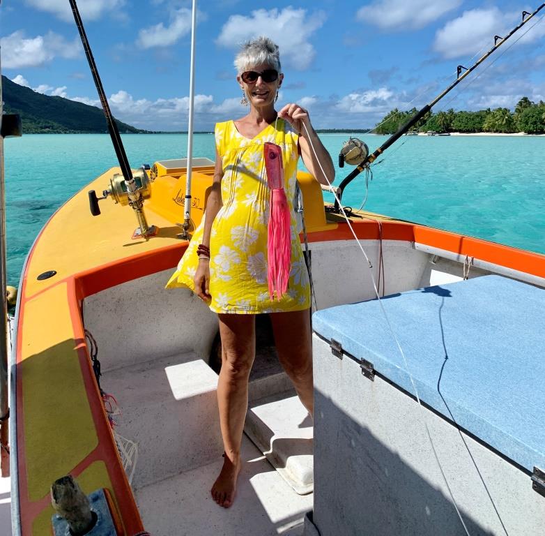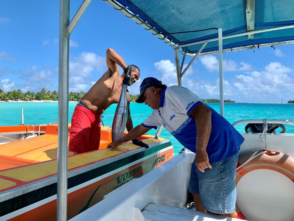 Et le plus compliqué paradoxalement c’est pour acheter du poisson ! bien sûr il y a des pêcheurs qui vont au large pour le thon, le mahi mahi (daurade coryphène), l’espadon …. Mais il n’y pas de criée, encore moins de poissonnerie. Il faut donc être au quai pile quand ils arrivent et même dans ces conditions ce n’est pas gagné car souvent le poisson est déjà réservé pour les pensions, voire des hôtels de Bora Bora, voisine de seulement 22 miles nautiques (environ 40km). En résumé, le poisson est déjà vendu avec d’arriver au quai…. Mais c’est sympa d’aller à la rencontre des pêcheurs, de découvrir leurs bateaux équipés de moteurs in-bord de 200 à 350ch, les cannes à pêche avec les énormes moulinets Shimano qui valent une fortune, les lances à 5 pics avec ardillons et surtout les écouter raconter leurs techniques de pêche. Par exemple pour le mahi mahi, il faut une mer très formée avec des vagues de 2/3 mètres, repérer l’endroit où il y a un mahi mahi grâce aux oiseaux et aux petits poissons qui sortent de l’eau car chassés par le mahi mahi. Ensuite le pêcheur se met à la hauteur du mahi mahi, le poursuit, le colle au mieux et lance son pic pour le harponner, le laisser se fatiguer un peu et le remonte enfin sur le bateau. Je précise que les pêcheurs sont seuls à bord… Je peux vous dire qu’ils sont athlétiques, taillés en V !!