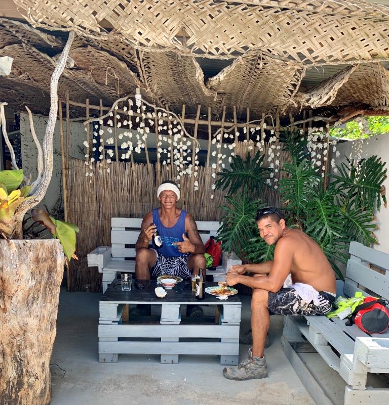 Le restaurant Tarona : avec Josée et Gérald …. et le p’tit salon détente du resto avec un fameux client : l’homme au bandeau est le champion actuel de coupe de noix de coco (discipline officielle des jeux polynésiens).