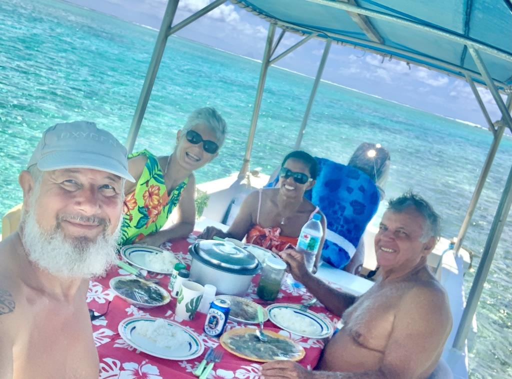 Des amis de Raiatea nous ont donné des contacts sur Maupiti : Josée et Gérald qui habitent sur le motu Tuanai. Une très belle rencontre, on aura passé beaucoup de temps ensemble. Ils aiment à partager leur culture et art de vivre. Josée est originaire de Maupiti et Gérald de Tahiti. Ils ont beaucoup voyagé et leur vie professionnelle a été bien remplie, leurs vies sont riches d’expériences… désormais ils apprécient grandement la vie tranquille sur leur motu. Par exemple on a passé en leur compagnie toute la journée du 11 nov sur leur bateau sur le lagon avec picnic à bord, plongée avec les raies (manta, léopard et pastenague) et recherche de coquillages. Josée en est très férue et m’a enseigné quelques-unes de ses techniques… j’adore !! Journée très fructueuse…
