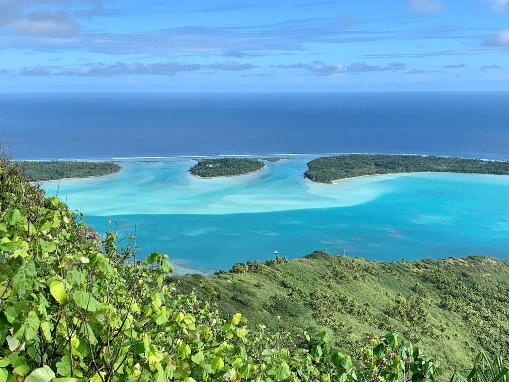Autre façon de profiter de Maupiti, pratiquer la randonnée jusqu’au point culminant. Nos on l’a fait 2 fois !! En fait on a voulu tester 2 chemins de descente, il a donc fallu monter 2 fois aussi…. La bonne technique consiste à partir dès 5h30 avec le p’ti déj dans le sac à dos, à la fraiche et pouvoir grimper léger. Le chemin est bon, bien indiqué, pas trop raide avec des cordes pour s’aider dans les parois rocheuses. La vue depuis le sommet vaut largement la peine. En plus il y a des rochers bien disposés qui permettent de s’installer confort pour prendre le p’tit déjeuner en contemplant le lagon et ses mille nuances de bleu, la passe, les motus… Sublime !